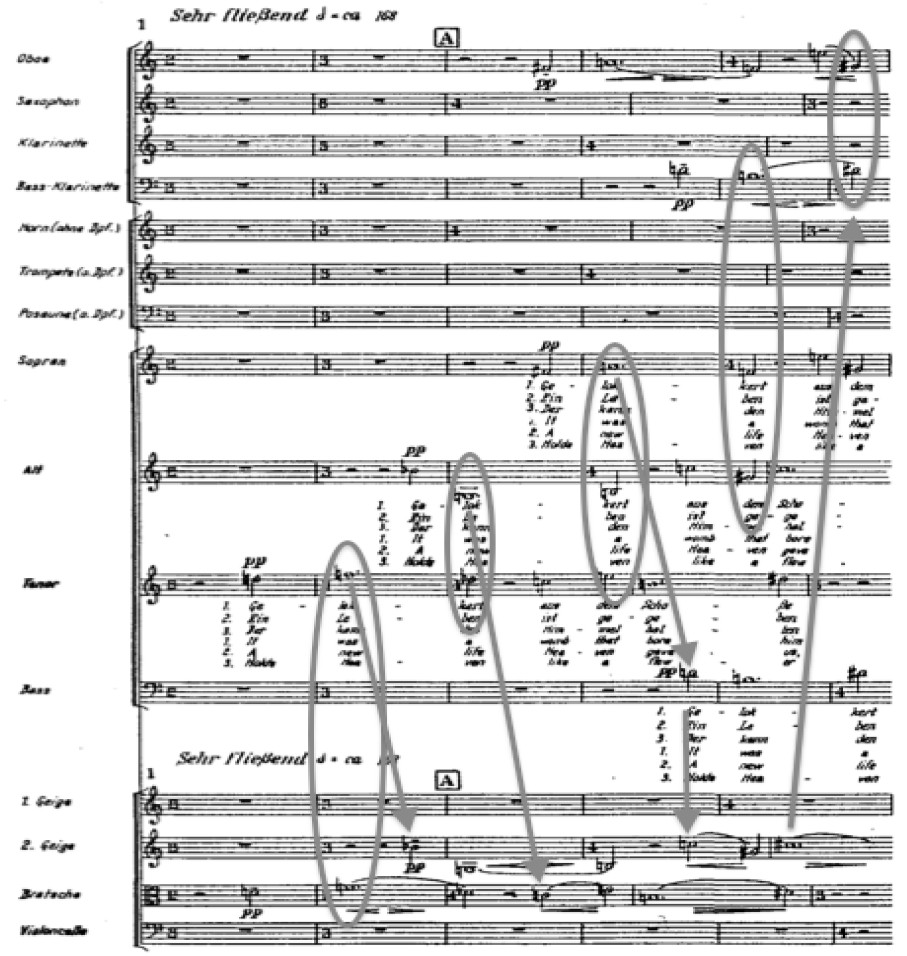 Pensare la verticalità. – Di considerevole interesse compositivo è riflettere su di una mancanza di controllo della dimensione verticale. Ad esempio il contrappunto usato da Webern nel sesto movimento della 2a cantata è esemplare dal punto di vista degli intervalli e per quanto riguarda ogni singola voce, ma gli incontri verticali provocano accordi del tutto incontrollati; statisticamente questo dà luogo ad accordi cromatici e dominati da seconde minori, ma anche ad accordi perfetti e ad accordi per quarte. Con questo si vuole dire che la classe della linea melodica non ha nulla a che vedere con la classe dell’armonia: le due classi sono incompatibili. Concepire e realizzare il rapporto verticale / orizzontale come funzione preparatoria (anacrusica allo sviluppo di tale relazione) significa organizzare una determinata armonia ricavandone il contrappunto (formulato dalle condotte melodiche) dallo stesso accordo iniziale da elaborare polifonicamente. In questo caso il contrappunto genera propriamente una compatibilità armonico-melodica, perché il verticale (simultaneità) e l’orizzontale (successione) sono prodotti dallo stesso elemento anacrusico (accordo iniziale) e controllati dalle medesime leggi. In concreto tutte le relative altezze sono dedotte le une dalle altre; le due dimensioni scaturiscono l’una dall’altra, così ottenendo una crescente integrazione delle voci. Di conseguenza non si può scrivere in due dimensioni differenti secondo due leggi differenti ma, al contrario, è necessario scrivere seguendo leggi che si applicano reciprocamente all’orizzontalità e alla verticalità proprio come nel XIV e XV secolo la grande invenzione del contrappunto ha fatto scoprendo le leggi del controllo verticale rispettando i rapporti orizzontali.